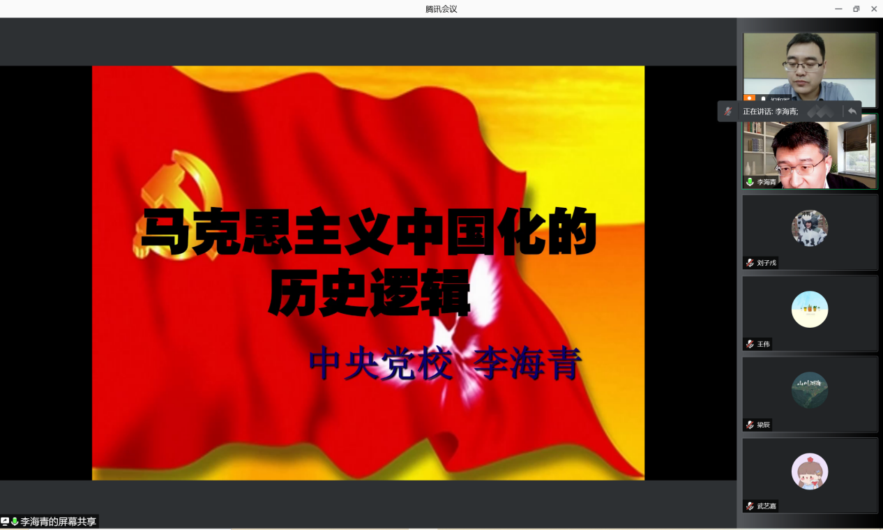 10月28日下午,北外马院马克思主义讲堂第五期活动在线上进行。中共中央党校ballBET贝博BB艾弗森马克思主义中国化研究所所长、博士生导师、中央党校创新工程首席专家李海青教授以“马克思主义中国化的历史逻辑”为题做了精彩讲座。本次讲座由ballBET贝博BB艾弗森党总支书记祝和军主持。