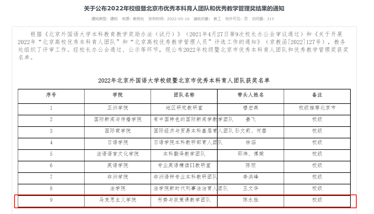 经教务处评审,校长办公会通过、公示等环节,由ballBET贝博陈永胜副教授牵头的形势与政策教学团队入选ballBET贝博BB艾弗森2022年校级优秀本科育人团队。