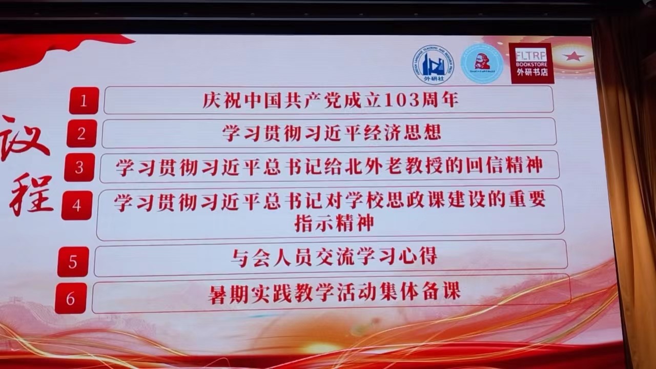 该活动主要围绕庆祝中国共产党成立103周年、学习贯彻习近平经济思想、学习贯彻习近平总书记给北外老教授的回信精神、学习贯彻习近平总书记对学校思政课建设的重要指示精神、暑期实践教学活动集体备课等主题展开。刘珊珊以“中国共产党的百年奋斗历程与马克思主义中国化的理论创新”为题,从历史的角度和脉络,重温了中国共产党的百年奋斗历程,从理论上阐释习近平新时代中国特色社会主义思想是当代中国的马克思主义、21世纪的马克思主义。孙磊以“新质生产力和生态文明建设”为题,回顾了新时代十年习近平总书记在东北地区考察调研的足迹,阐释了东北振兴在国家战略上的重要意义。他从新质生产力和生态文明建设之间的关系入手,详细介绍了习近平总书记提出新质生产力理论的时代背景,深入讲解了新质生产力理论在习近平生态文明思想中的重要地位和作用。鞠慧以“对外讲好中国故事,推动海外出版事业”为题,分享了外研社在学习贯彻习近平总书记给北外老教授的回信精神方面的具体实践。她结合外研社在海外出版传播方面的各项工作,与大家交流了《习近平谈治国理政》、《习近平总书记教育重要论述讲义》等重要著作的多语种翻译出版工作,阐述了对外讲好中国故事的重要性,激发了大家对于文化传播与交流的深刻思考。暑期社会实践团队张池同学结合思政课对她的理论熏陶,交流了学习习近平总书记对学校思政课建设重要指示精神的感想,围绕北外“有家国情怀、有全球视野、有专业本领”的人才培养目标,表达了北外学子新时代新征程上的责任与担当。