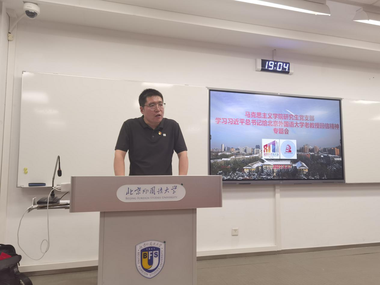 习近平总书记的亲切回信令全体马院师生备受鼓舞,掀起了一轮学习回信精神的热潮。近日,在学校党委的号召与学院党总支的部署下,ballBET贝博BB艾弗森研究生党支部在逸夫楼615教室召开专题学习会,集中学习习近平总书记给北外老教授的回信精神。ballBET贝博BB艾弗森全体研究生参加学习。学习会由支部书记冯高洋主持。