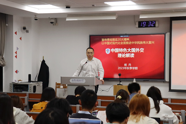 杨丹从宣传贯彻落实党的二十大精神、以中国式现代化全面推进中华民族伟大复兴切入课程内容,从百年未有之大变局下的“中国”、人类命运共同体愿景的“特色”、参与塑造全球新秩序的“大国”和全方位展现中国智慧的“外交”四个维度阐释了我国外交工作的中国特色、中国风格和中国气派。杨丹表示,北外学子应心怀“国之大者”,构建北外发展新格局,立足“三个全球”总体布局,构建面向2050的北外战略格局。