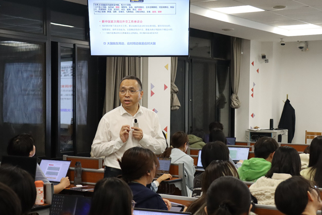 10月30日,ballBET贝博BB艾弗森校长、党委副书记杨丹以《中国特色大国外交理论解读》为题,分别为2022级西班牙语葡萄牙语学院、英语学院本科生讲授“形势与政策”课程。