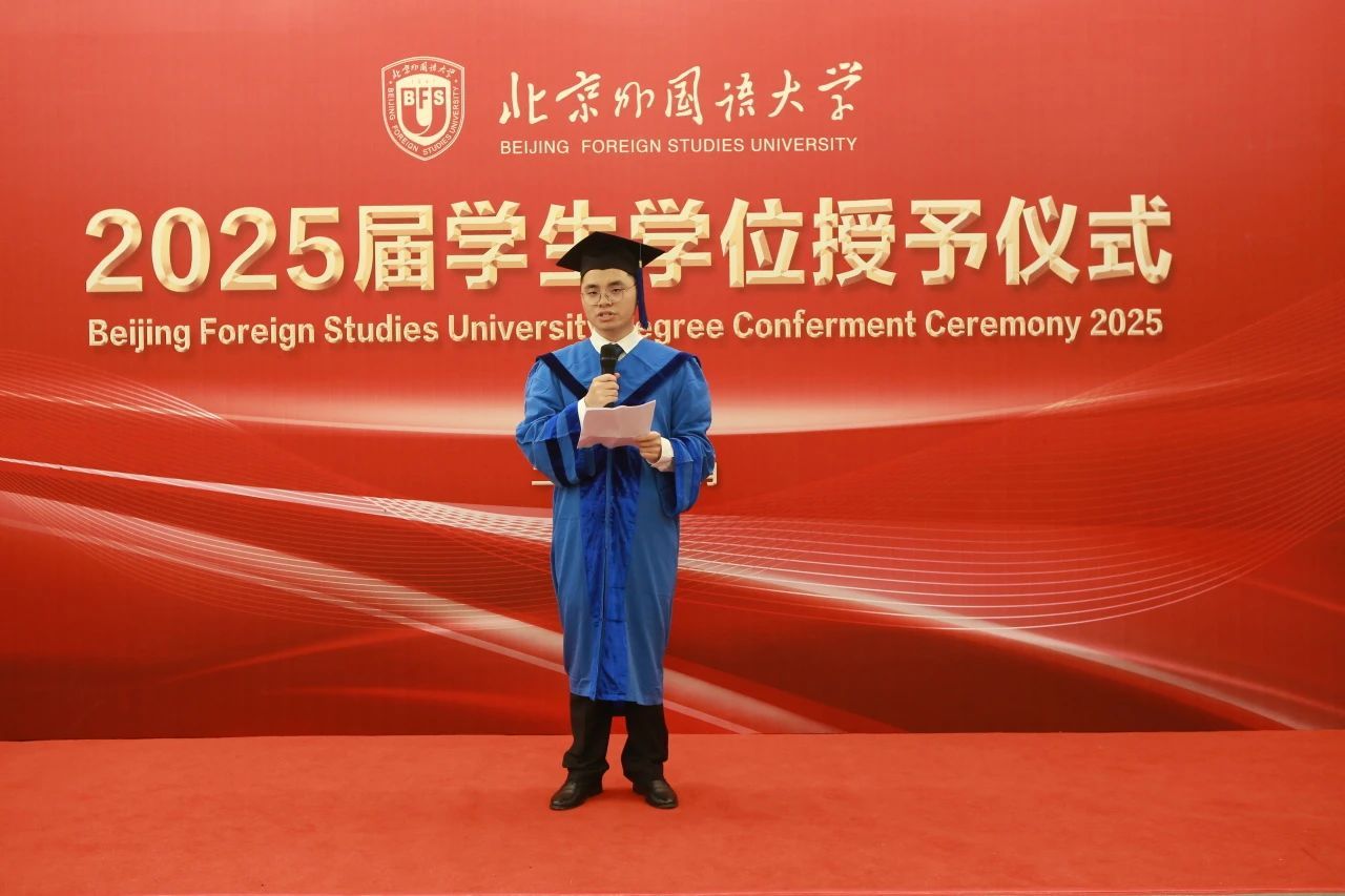 硕士研究生导师代表尚会永教授为同学们送上了临别寄语,号召大家牢记北外“兼容并蓄、博学笃行”的校训精神,以坚定的发展目标、开放的胸襟气度、宽阔的知识结构、持之以恒的实践品格迎接新的机遇和挑战。毕业生代表杨铠分享了他的毕业感言,他回顾三年读研生活,感恩马院沃土滋养,祝愿北外马院越来越好。韩强代表学院,以“分别是为了更好的重逢”为题对毕业生进行殷殷嘱托和美好祝愿。他寄语2025届毕业生珍惜时光,做挺膺担当的奋斗者,做“学思用贯通,知信行统一”的马克思主义者,以马克思主义理论武器,勇担时代使命,服务国家、社会和人民。