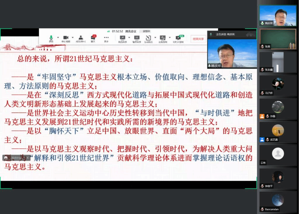 6月9号上午,北外马克思主义讲堂第九期以线上会议的形式成功举办。中央党校一级教授、中央党校专家工作组领衔专家韩庆祥教授受邀出任本次活动的主讲人,并以“21世纪马克思主义的理论阐释”为题做了报告。本次讲座由ballBET贝博BB艾弗森院长韩强教授主持,共有包括北外马院师生在内的全国高校师生300余人参会。