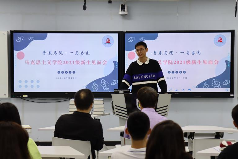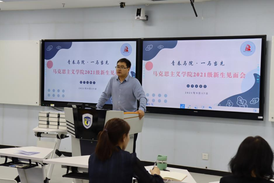 党总支书记祝和军老师致辞欢迎新生加入马院大家庭,他向新生介绍了马院发展历史,以及国家、学校对马院和马克思主义理论学科的高度重视。他谈到,马院正在重大发展机遇下不可逆转地进入发展快车道,为促进学院发展,今年ballBET贝博引进了韩强、左高山两位教授,相信他们的加入会使马院越来越好。随后他表示,马院的发展离不开每一位同学的努力,他号召同学们为壮大马院贡献力量,并从两个方面为新生提出建议:一是要树立底线思维,把握好学生身份,把学习作为主责主业;二是要避免系统性风险,注重人身安全、财产安全和政治安全。
