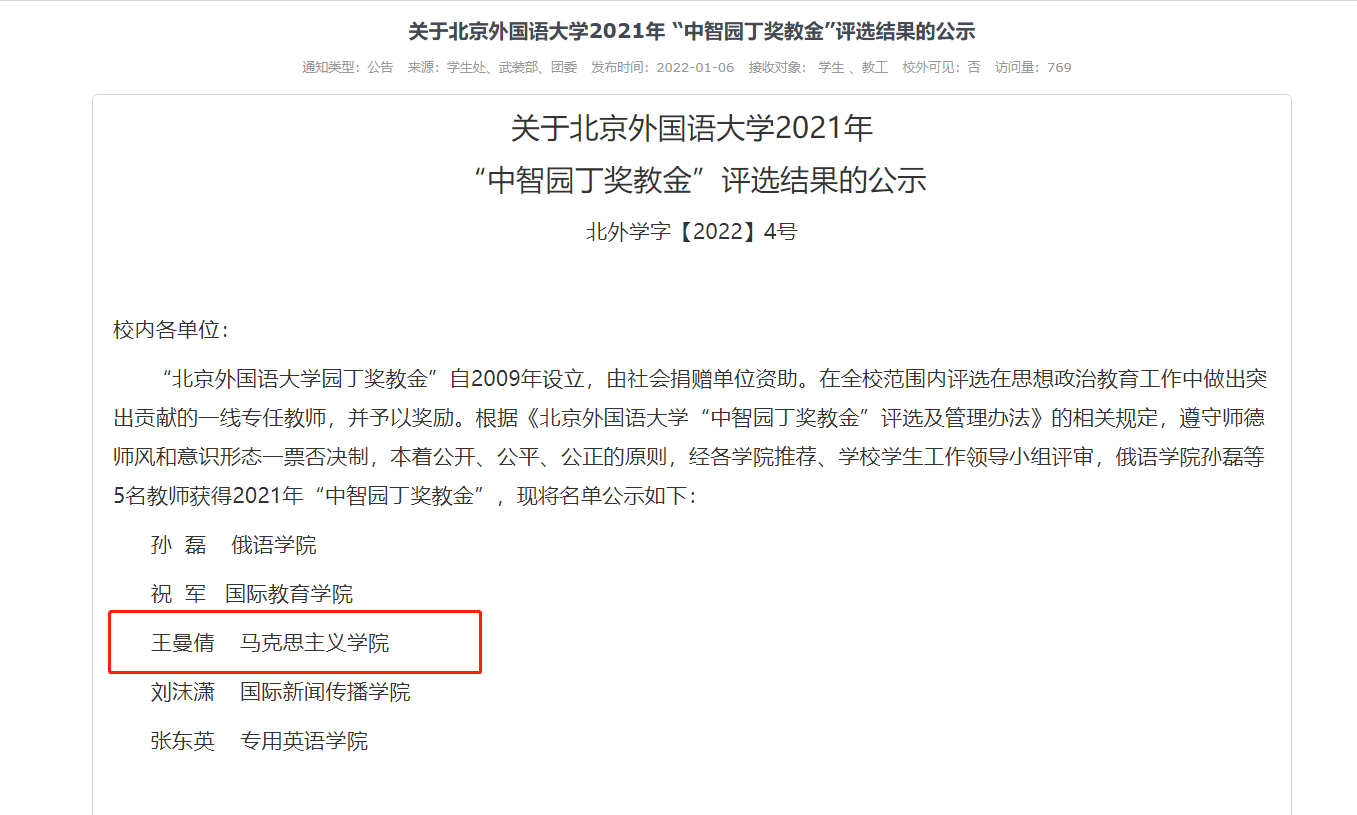 根据《ballBET贝博BB艾弗森“中智园丁奖教金”评选及管理办法》相关规定,遵守师德师风和意识形态一票否决制,本着公开、公平、公正的原则,经各学院推荐、学校学生工作领导小组评审,共有包括ballBET贝博王曼倩副教授在内的5名教师获得2021年“中智园丁奖教金”。