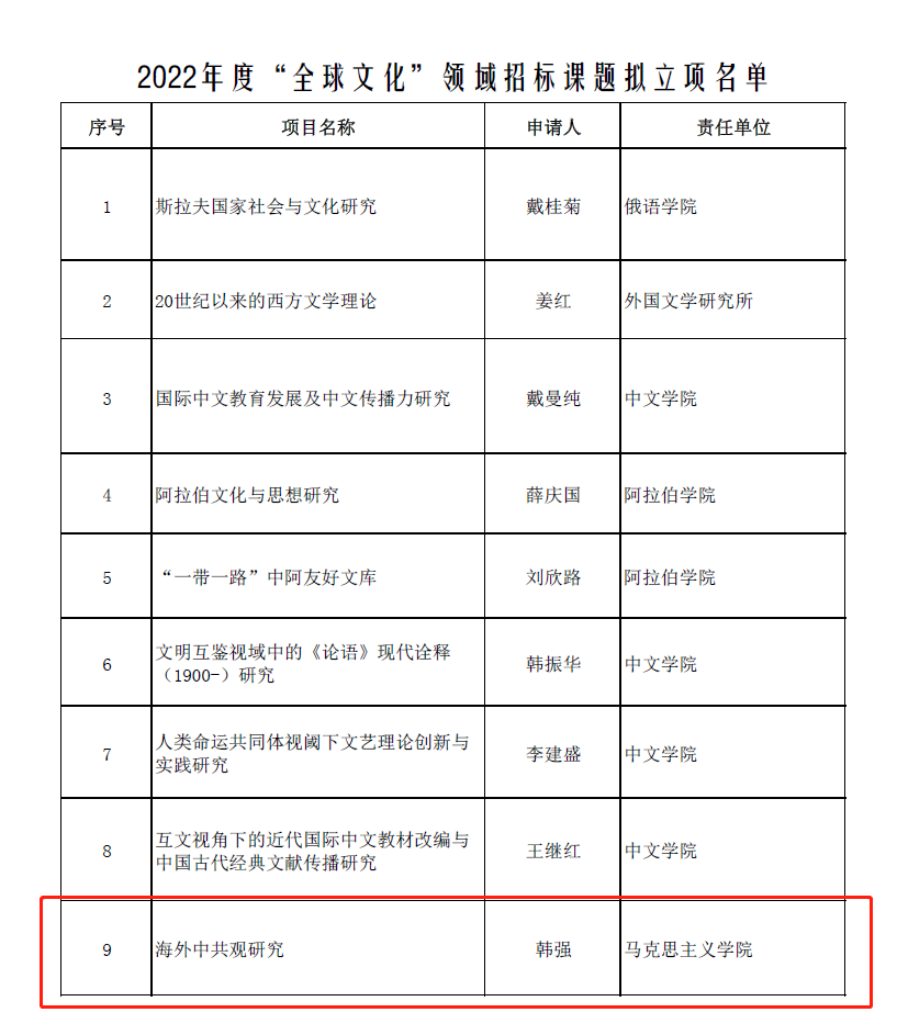 经全校教师自主申报、协作组答辩评审、学校“双一流”重大标志性成果工作组审定,ballBET贝博韩强教授课题“海外中共观研究”入选北外“双一流”全球文化类重大(点)项目。